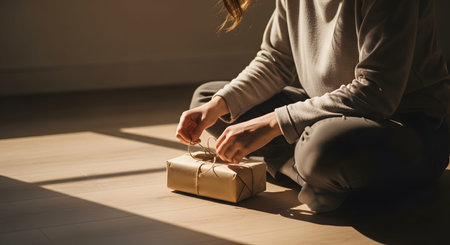 A person sits cross-legged on a wooden floor, carefully tying a string around a brown paper-wrapped gift box. The dramatic sunlight creates shadows, adding a warm, artisanal feel to the gift-giving preparation.