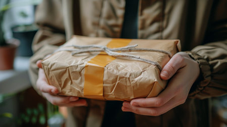 A person holding a wrapped present in brown paper, preparing to give or receive a gift during a special occasion.