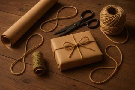 Wrapping a brown paper gift with natural twine, scissors, and wrapping paper supplies on a rustic wooden table