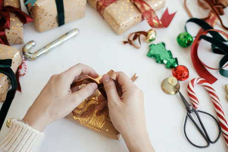 Preparing for Christmas concept. Top pov above overhead close up view photo of female hands wrapping presents making bow on workplace