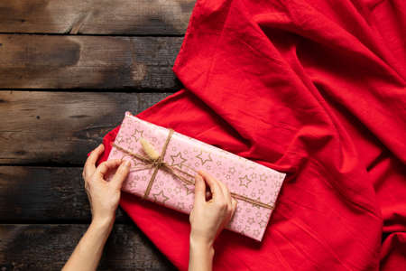 Top view on hands of unknown caucasian woman holding wrapped gift box birthday present