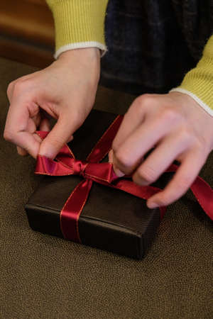 Warm White Sweater, Female Hands Beautifully Tie Lace Ribbon on Gift Box for Celebrating