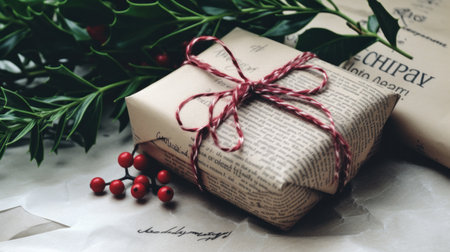 A festive arrangement of Christmas gifts wrapped in brown paper and tied with twine, adorned with greenery, berries, and nuts on a textured surface.