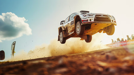 A dynamic shot capturing a rally car in a high-speed accident on a dirt road, surrounded by flying dust and leaves, emphasizing thrill and excitement.