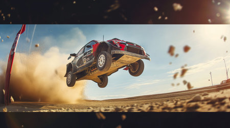 A wide shot captures a thrilling moment of a car accident during the Dakar Rally, showcasing dust and debris flying as the vehicle catches air in a dramatic off-road scene.