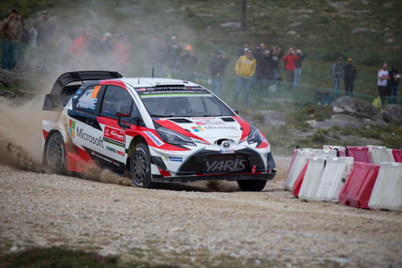 PORTO, PORTUGAL - MAY 17: Ott Tanak of Estonia and Martin Jarveoja of Estonia competes in their Toyota Gazoo Racing WRT Toyota Yaris WRC during the shakedown of the WRC Portugal on May 17, 2018.