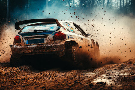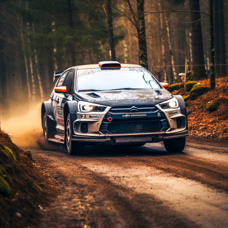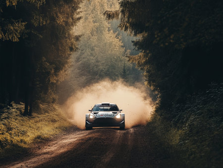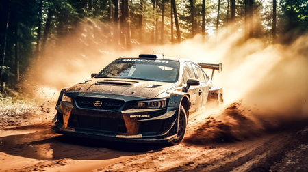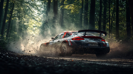 Thrilling rally car speeds through a dusty forest road, creating a dynamic scene of action