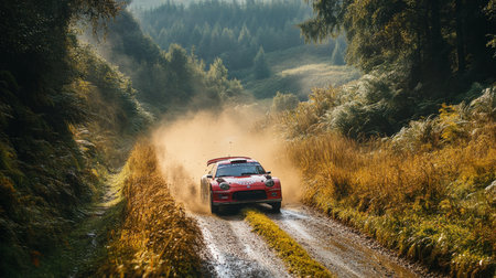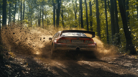 A rally car navigates a dirt trail in a dense forest, kicking up clouds of dust. The image captures the speed and intensity of the race. Concept of adventure and motorsport