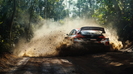 Dynamic action shot of rally car drifting through dusty forest road with vibrant sunlit background