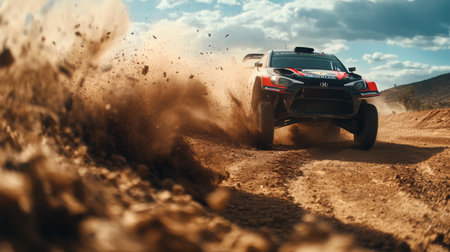 Rally Car Driving in Dirt, Causing Black Clouds of Dust. Generative AI. high quality illustration