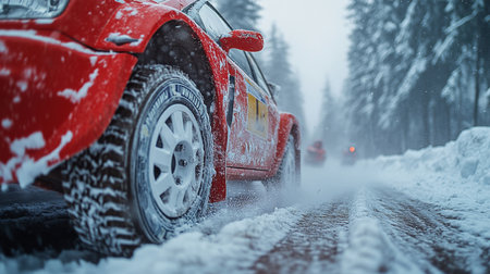 Red rally car navigating through a snowy forest path during a winter motorsport event in challenging weather conditions. Generative AI