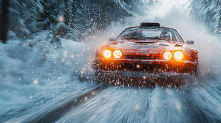 Snow-covered rally car racing through a forested landscape during a winter storm, showcasing dynamic movement and spray. Generative AI