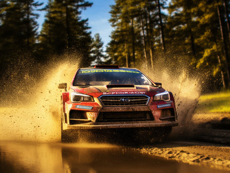 A rally car splashes through a muddy forest stream at sunrise, surrounded by tall trees and misty atmosphere. Generative AI