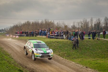 Sveta Nedjelja, Croatia - November 24, 2019. 10th Rally Show Santa Domenica. Andreas Aigner and Ilka Minor in Skoda Fabia R5 at the jump section of the track.