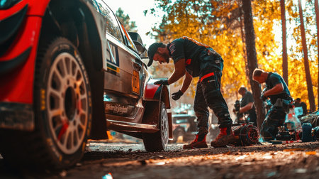 Mechanics diligently work on a rally car in a forested area during a competition, showcasing teamwork and technical skills in automotive repair.