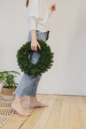The girl holds in her hands a New Year, Christmas wreath, decorations for the home. Against the background of the store