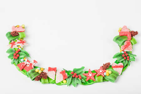 Christmas winter wreath, candy canes, Christmas tree decorations and gingerbread cookies on old white wooden background. Wallpaper, background or holiday art. Top view