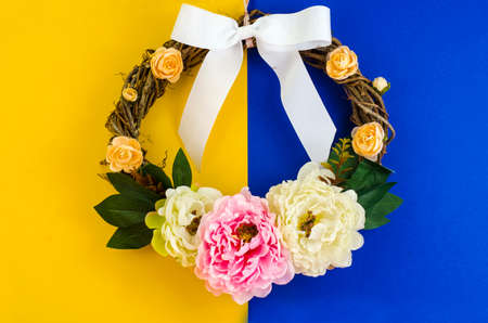 wreath of yellow flowers dandelions on the background of the evening spring day