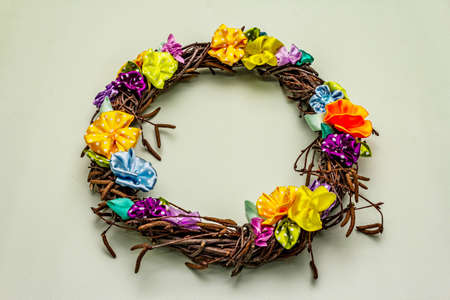 Spring composition of a wreath of birch branches and craft colorful flowers. Handmade from satin polka dot ribbons, stay at home concept. Light green background