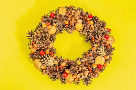 Autumn wreath of cones, nuts, and berries. Creative composition, the handmade. Home decoration festive concept. Bright yellow background, top view