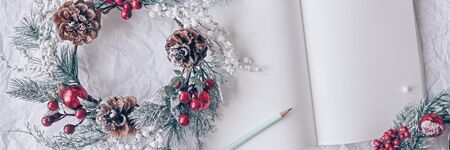 Christmas concept. White notebook with christmas decoration, wreath on a white background. Minimal winter vacation idea. Flat lay top view composition.