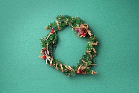 Christmas Wreath, Holiday Composition on a Green Background. Top View