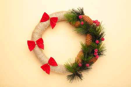 Green christmas wreath decorated with red bow on biege background. Thanksgiving Day. Top view.
