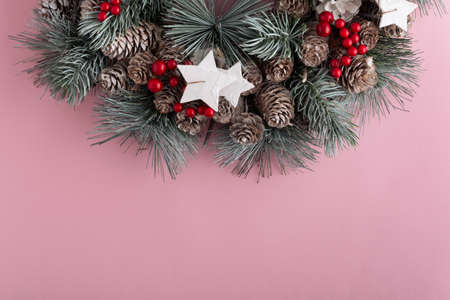 Christmas wreath on pink background. New Year pattern. Copy space.