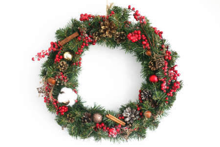 Christmas wreath hanging on white wall in house.Traditional christmas wreath with red berries and ornaments, pine cones and cinnamon isolated on white, holiday decor. Space for text