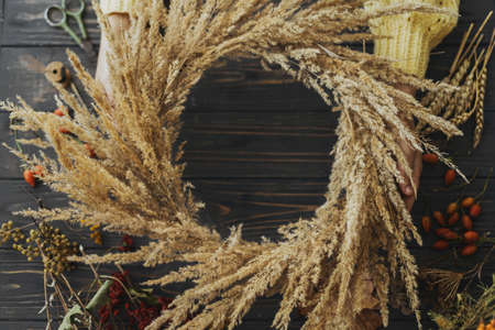 Hands holding stylish autumn wreath with dry grass, wildflowers, herbs and berries on rustic wooden background. Top view. Making rustic autumn boho wreath, holiday workshop