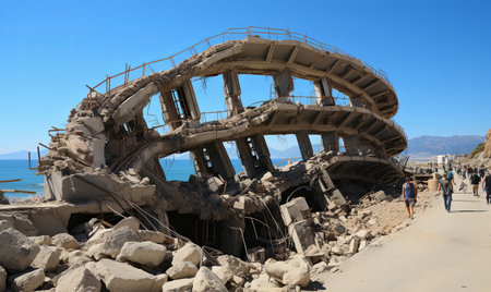 This image captures the aftermath of a calamitous event, showing a partially collapsed building surrounded by debris amidst an urban landscape.