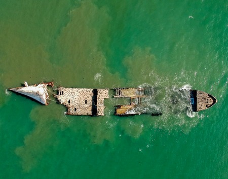 Crimea, Cape Tarkhankut, August 2020. Remains of the sunken ship Ibrahim Yakim off the coast of Cape Tarhankut.