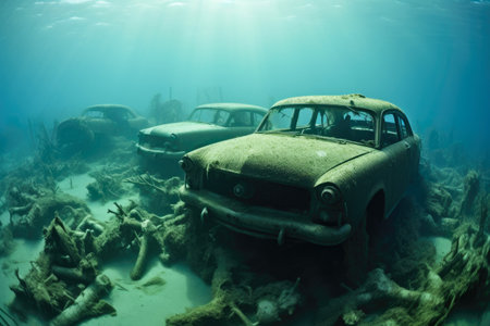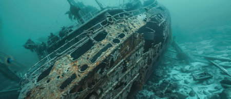 Explore a fascinating underwater shipwreck adorned with colorful coral and teeming marine life. Sunlight pierces the clear blue water, illuminating this submerged historical marvel.