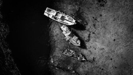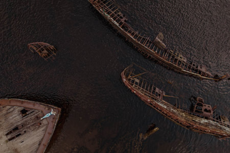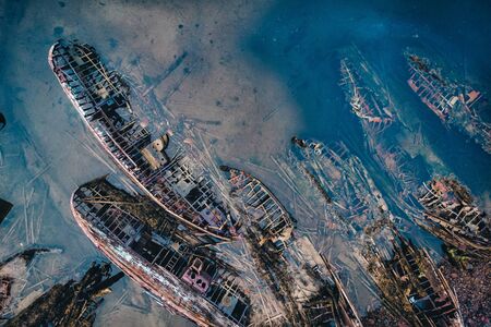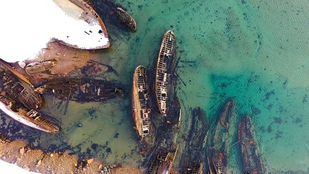 Cemetery of old ships in Teriberka Murmansk Russia, dramatic photo. Aerial top view