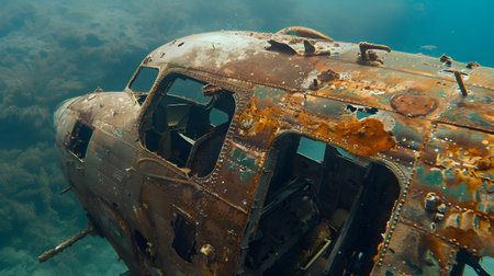 An ancient aircraft rests on the ocean floor, cloaked in marine mysteries.
