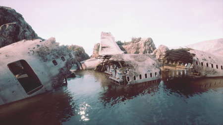 An abandoned airplane wreck lies partially submerged in calm waters, surrounded by rugged cliffs. Sunlight illuminates the scene, creating an eerie yet beautiful atmosphere.