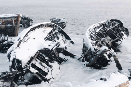 Ship cemetery in the Murmansk region in the village of Teriberka on the shore of the Barents Sea