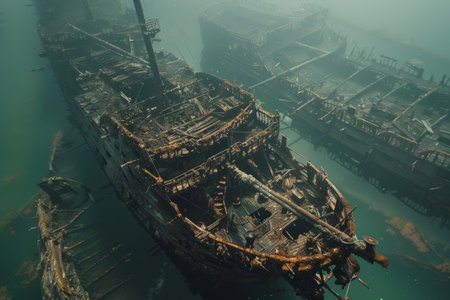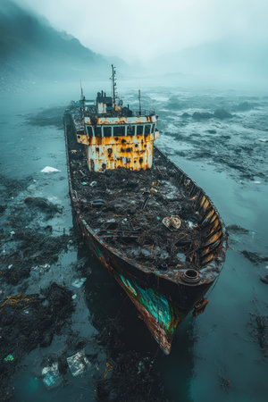 Rusty shipwreck rests in still, murky waters, shrouded in morning fog. Surrounding debris hints at environmental challenges, revealing a haunting, lonely landscape.