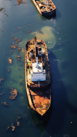 Submerged shipwreck amidst clear blue waters, showing intricate coral growth and underwater exploration potential.