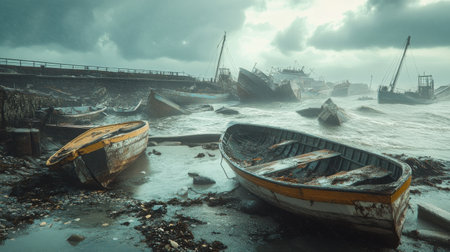 Hurricane winds have tossed boats onto the shore, leaving debris and overturned docks scattered along the coastline as turbulent waves crash in the background.
