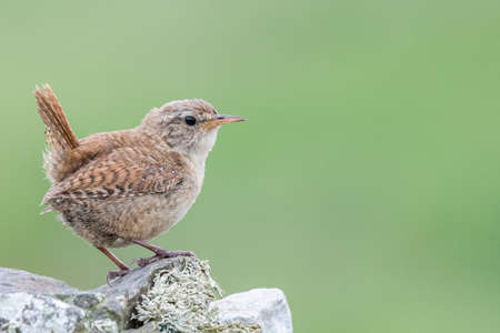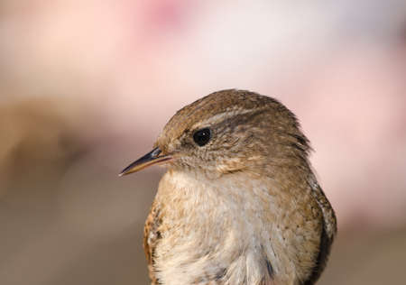 Early migrants of Eurasian wren (Troglodytes troglodytes) shot close-up against a blurred background in soft morning light