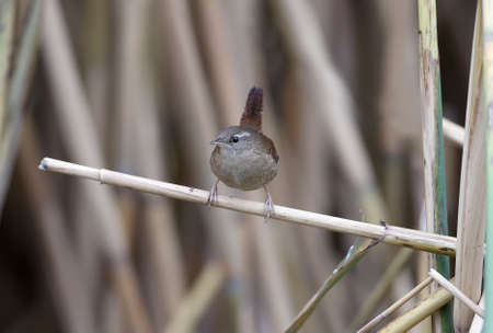 Eurasia wren close-up photo in natural habitat on a thin branch of reed