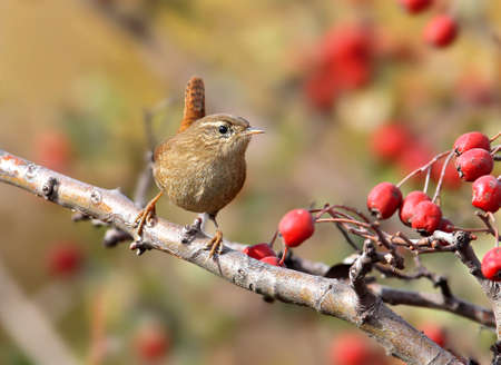 Close up photo of eurasian wren sits on a branch wit bright red berries on beige blurred background