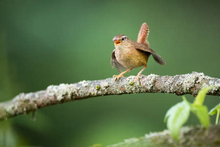 Eurasian wren, troglodytes troglodyte, calling on branch in spring nature.
