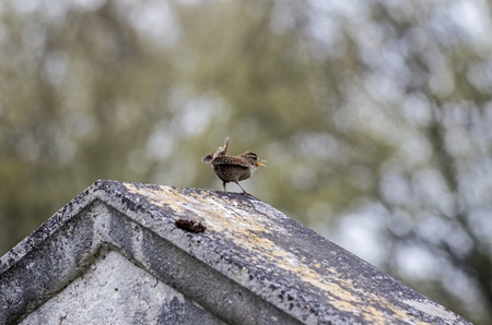Closeup of a Eurasian Wren bird, Troglodytes troglodytes, bird singing in a forest during Springtime