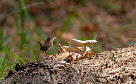 Eurasian Wren (Troglodytes troglodytes) closeup next to mushroom, Bialowieza Forest, Poland, Europe