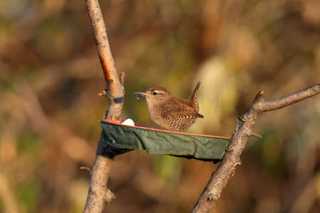The Eurasian wren (Troglodytes troglodytes) or northern wren perching on twig.