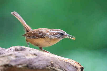 Carolina Wren Thryothorus ludovicianus perching on a log and eating worms in Maryland during the Spring