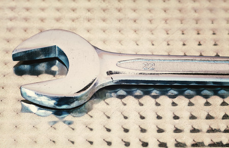 a spanner on old abandoned iron plate. - industrial workshop hand tools concept.