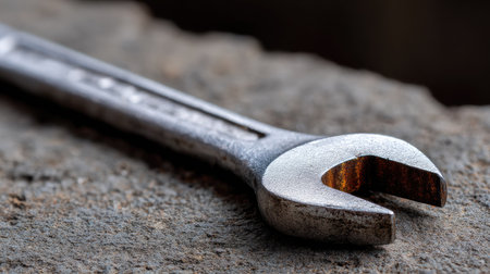 AI Generated. Close up of a rustic metal wrench on dark surface